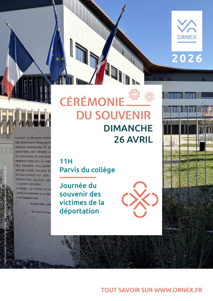 À l’occasion de la Journée nationale du souvenir des victimes de la déportation, la Ville d’Ornex organise, pour la première fois, une cérémonie officielle le dimanche 26 avril à 11h, sur le parvis du collège Simone Veil, devant la stèle commémorative.