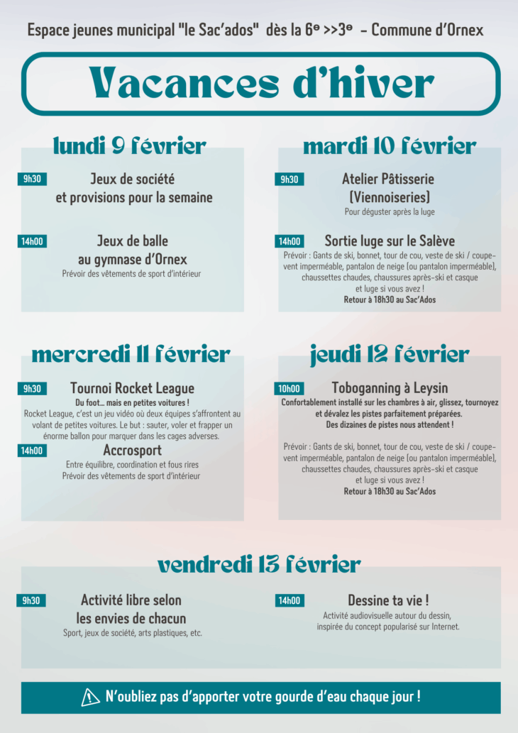 | HIVER | du lundi 19 au vendredi 30 jan 2026 | du lundi 26 au vendredi 30 jan 2026 | Du lundi 19 au vendredi 23 jan 2026 | du lundi 9 au vendredi 20 fév 2026 |